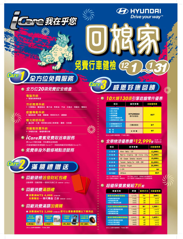 Hyundai汽車新春回娘家服務活動12月1日開跑!iCare三大優惠專案實施中〈2010年12月1日至2011年1月31日〉