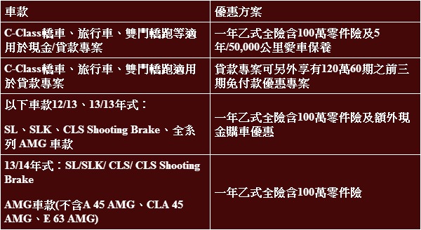 台灣賓士特別針對旗下C-Class推出超值優惠方案,凡購買C-Class 轎車、旅行車或雙門轎跑車款,並在十一月份完成交車、掛牌者,即享有1年乙式全險含100 萬零件險以及5年5萬公里保養套裝。