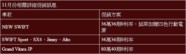 繼旗下人氣車款Swift於10月份全新改款上市熱潮,Taiwan Suzuki宣布11月份最新促銷活動。
