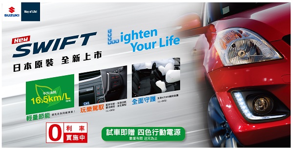 引擎上更加節能環保擁有絕佳的油耗表現,相信一定能帶給消費者前所未有的玩樂新體驗,到哪都能成為眾人目光中的亮點,全新Swift共有五款車色可供選擇,GLX車型建議售價為NT$62.8萬,GL車型則為NT$57.8萬,只要試乘New Swift,還可獲得由Suzuki設計的專屬時尚行動電源試乘禮!