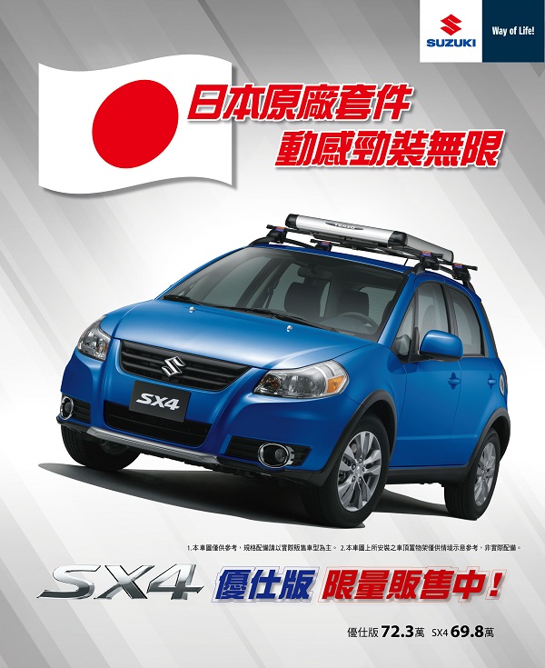 Suzuki旗下另一人氣車款SX4,本月份也推出優仕版車款,加贈日本原廠套件,車體外觀下包前後加裝鍍鉻飾板,霧燈部分也加裝銀面飾圈,另外在尾燈、油箱與門邊等也加裝飾條,只要再加價NT$25,000即可擁有八項配件升級優惠,讓外觀看起來更為動感,售價NT$72.3萬,喜愛SX4車款的朋友們千萬要把握機會到Suzuki全省經銷商一窺究竟。