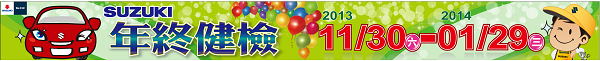 自2013/11/30起至2014/1/29止,Taiwan Suzuki全台經銷商服務廠舉辦2013年Suzuki年終健檢活動,為回饋所有Suzuki車主長期以來的支持與愛護,回廠除了享有16項愛車免費健診服務之外,再推出常用零件和化學商品等多項零件優惠外且再加碼車身鈑烤優惠,以及活動期間內更換指定品牌輪胎,即可獲得Suzuki為您精心準備的精美好禮,歡迎各位車主把握機會,除了為您的愛車進行健康檢查與清潔保養外,也可以完美的車況為地球節能盡一份心力,一起平安迎新、歡喜過新年!
