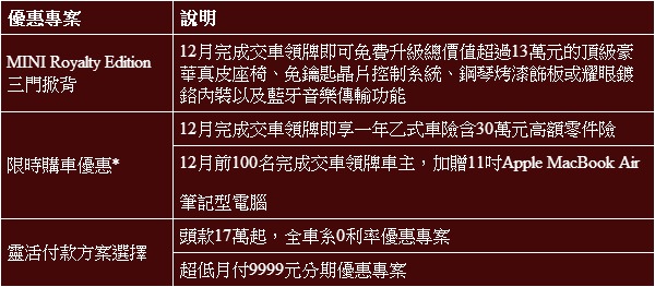 而為了讓更多Mini Fans可以輕鬆實現擁有Mini的夢想,凡於年底前入主全車系,即可享一年乙式全險含30萬高額零件險;前100名入主Mini車主更可獲得11吋Apple MacBook Air筆記型電腦;超低月付9,999元分期優惠專案同步實施中,敬請把握擁有Mini最佳時刻。