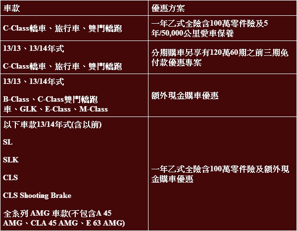台灣賓士二月份針對13/14年式(含以前)之SLK、SL、CLS 、CLS Shooting Brake以及AMG系列車款(不含A 45 AMG、CLA 45 AMG、E 63 AMG),凡在二月份完成交車、掛牌之客戶,享有1年乙式全險含100萬零件險,並另享額外現金購車優惠。