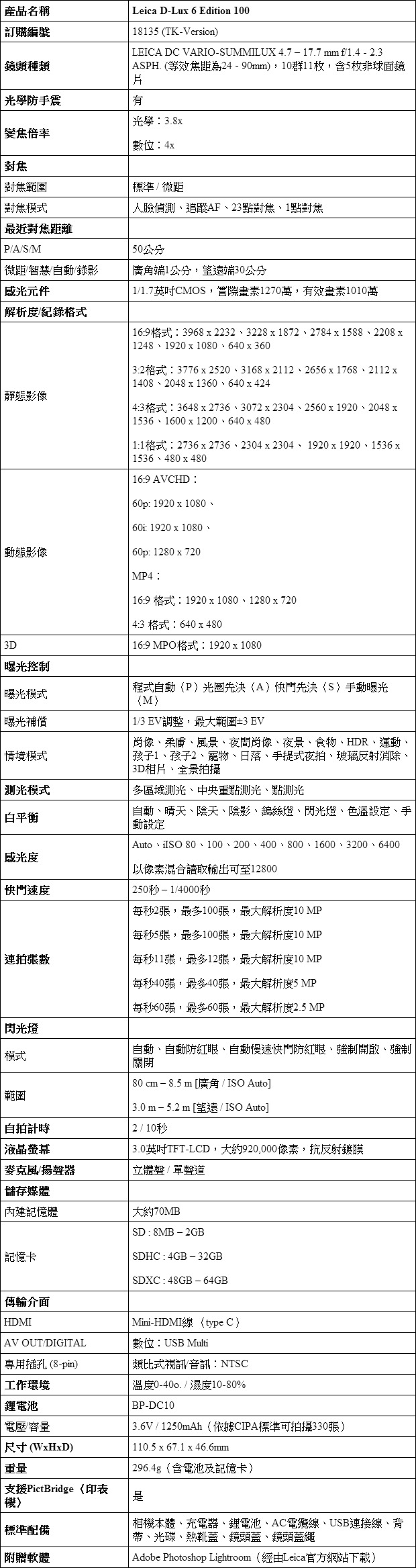 技術規格:(與Leica D-Lux 6相同)