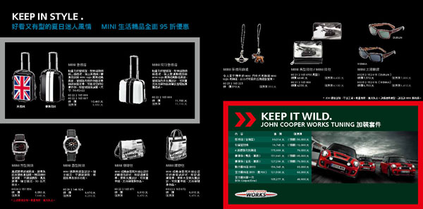 而深受喜愛的個性化精品與加裝品,在新的季節裡也準備好為您和心愛Mini呈現新的風貌!搭配英國旗系列外觀加裝品,讓您的Mini充滿英倫風情,營造宛如威廉王子英國世紀婚禮幸福氛圍;若選擇Mini RAY霓光系列,則是讓您的百變Mini具有強烈的都會風貌,馳騁街道更加搶眼! 倘若熱愛挑戰山林樂趣,那麼off-road空力套件組肯定會讓您的Mini COUNTRYMAN運動休旅更具粗曠與越野風格。擁有純正賽車血統的JOHN COOPER WORKS改裝套件也同步推出各項加裝優惠,讓您可依照自己的喜好裝扮最COOL的個性化愛車。