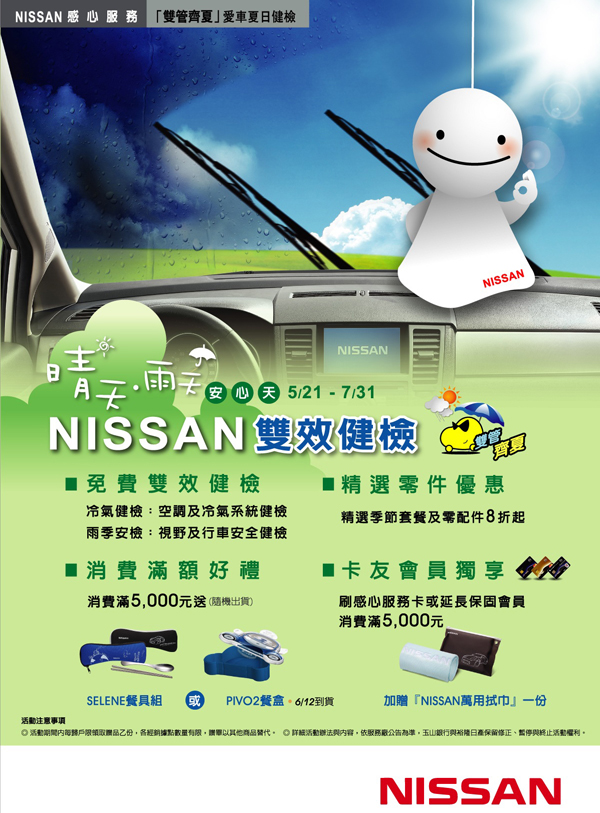 參加Nissan「雙管齊夏」活動,除了上述原廠檢查服務及優惠之外,於活動期間回廠消費滿5000元,即可獲得「Pivo2造型餐盒」或「Selene環保餐具組」。感心服務卡卡友或延長保固會員於活動期間消費滿5000元加贈萬用拭巾一份,另享有消費積點紅利兩倍送及感心服務卡刷卡3期0利率優惠。相關活動詳情,請洽Nissan服務專線 0800-088888或Nissan企業網站www.nissan.com.tw,以及活動專屬網頁http://www.nissan.com.tw/edm/201005_Summer/index.html。