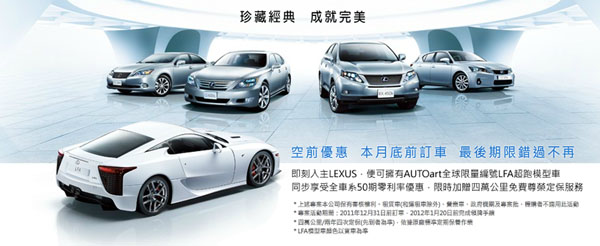 3.2011年底前訂車(Lexus全車系)並於2012/1/20前完成領牌手續之新車車主,加贈「四萬公里免費尊榮定保服務」+「限量LFA超跑模型車交車禮」。(詳情請洽全省Lexus展示中心)