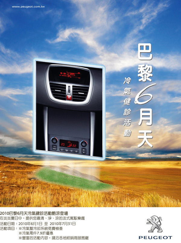 炎炎夏日即將來臨,為使Peugeot、Citroen車主們能擁有一個沁涼、舒適的夏季行車時光,Peugeot Citroen服務總代理寶嘉聯合自即日起至7月31日止舉辦「巴黎6月天」冷氣健診活動,為您愛車的冷氣系統把關,讓您與愛車輕鬆渡過夏日熱浪的「烤」驗。