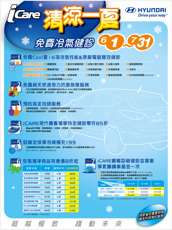 三陽現代汽車提出:免費Cool夏16項冷氣性能&原廠電腦雙效健診、免費純天然速倍力抗菌除臭服務、預約指定技師服務、iCARE現代貴賓,獨享特定健診零件85折、回廠定保享冷媒補充199、空氣清淨商品特惠價8折起、iCARE貴賓回廠健診並賞車享累積購車基金1次(限乘用車)等七大車主關心夏日保養項目,並結合現代汽車新策略〝 i 〞的理念,以〝 i Care 〞來做為這一次的宣傳理念。