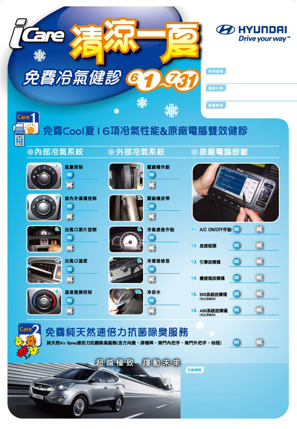 三陽現代汽車免費行車冷氣健檢「Hyundai iCare2010清涼一下免費健診活動」,不僅關心您的愛車,也關心你的感受;讓你在炎炎夏日,行車安全神清氣爽;三陽現代汽車的車主們,趕快行動,6月1日起,快開著你的愛車,到三陽現代汽車接受專業技師們的熱情服務款待喔~!