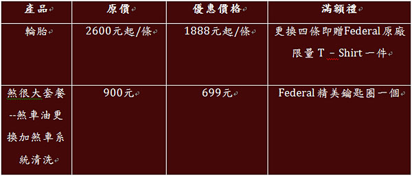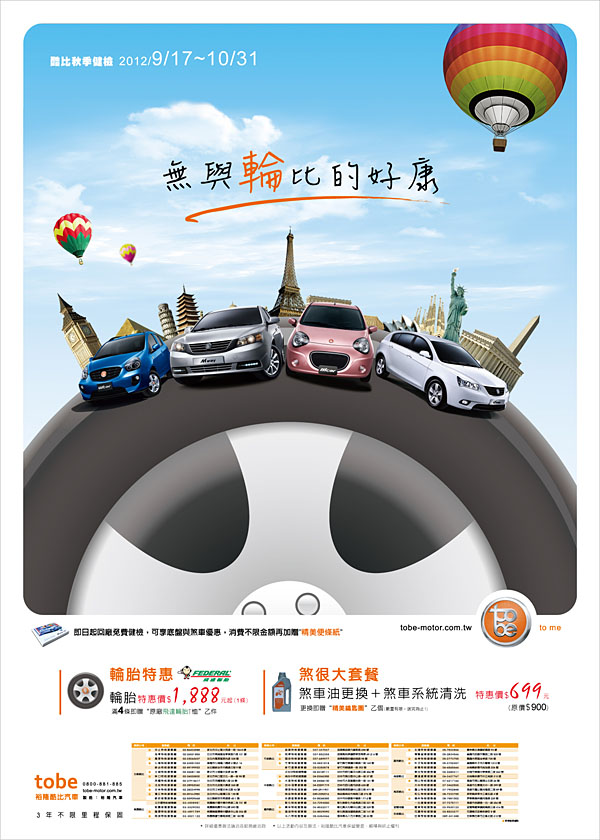 涼爽的秋天即將來臨,秋天清爽的徐徐微風最適合全家出遊了,tobe裕隆酷比汽車堅持提供消費者最聰明的購車選擇,以打造最低總擁車成本為出發點,推出「無與輪比」秋季健檢活動,即日起10月31日止,除提供21項全車與底盤系統的免費安檢,更祭出多項零件惠方案,輪胎、煞車化學品套餐等,讓酷比的車主”Fun” 心去賞楓。回廠消費不限金額即加贈M’way車型便條紙,更有消費滿額好禮,更換四條輪胎即贈Federal 原廠限量 T –Shirt 一件,購買煞車油更換加煞車系統清洗「煞很大套餐」即加贈Federal 精美鑰匙圈一個,以上贈品數量有限贈完為止,請儘速回廠。