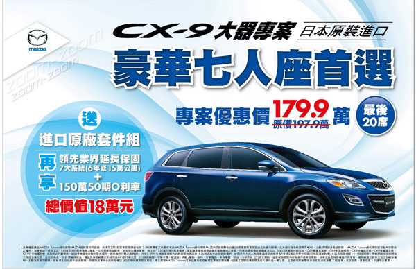 而針對菁英消費客層的豪華旗艦跑旅CX-9超值優惠179.9萬元大器專案,原訂限量50台已進入最後倒數,也請層峰消費者把握機會!現在購車還享有價值5萬元的原廠進口車身套件(包含專屬車頂架、車頂架橫桿、前後擋泥板、行李廂置物墊),及6年或15萬公里七大系統延長保固、150 萬50期0利率,總優惠價值超過18萬元!只要頭款29.9萬元,就能將Mazda頂級旗艦跑旅開回家!.相關優惠訊息請洽Mazda各地經銷商,或上Mazda Taiwan官方網站http://Mazda.com.tw查詢。
