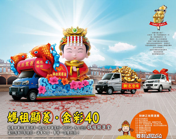 除了乘用車外,中華三菱也不忘照顧廣大的商用車頭家,推出買中華菱利VERYCA送『媽祖開運金』,讓你有BUY有保庇!詳情可洽全台Mitsubishi MOTORS展示中心或上官網 www.5230.com.tw查詢。
