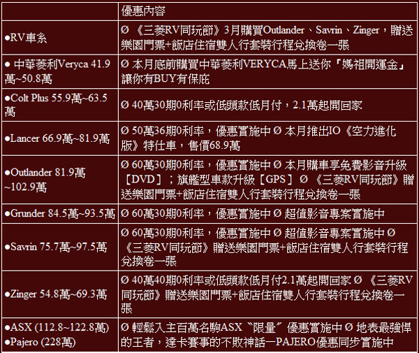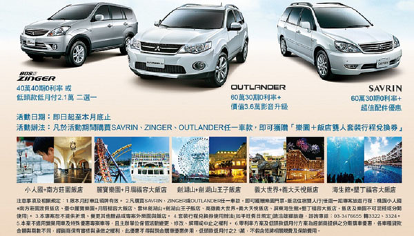 「三菱RV同玩節」促銷活動,凡購買RV車(Outlander、Savrin、Zinger) 即可享有總價值達1.3萬元的精選飯店住宿+遊樂園門票雙人行程(包括小人國+南方莊園假飯店、麗寶樂園+月眉福容大飯店、劍湖山+王子大飯店、義大世界+義大天悅飯店、屏東海生館+墾丁福容大飯店等)。