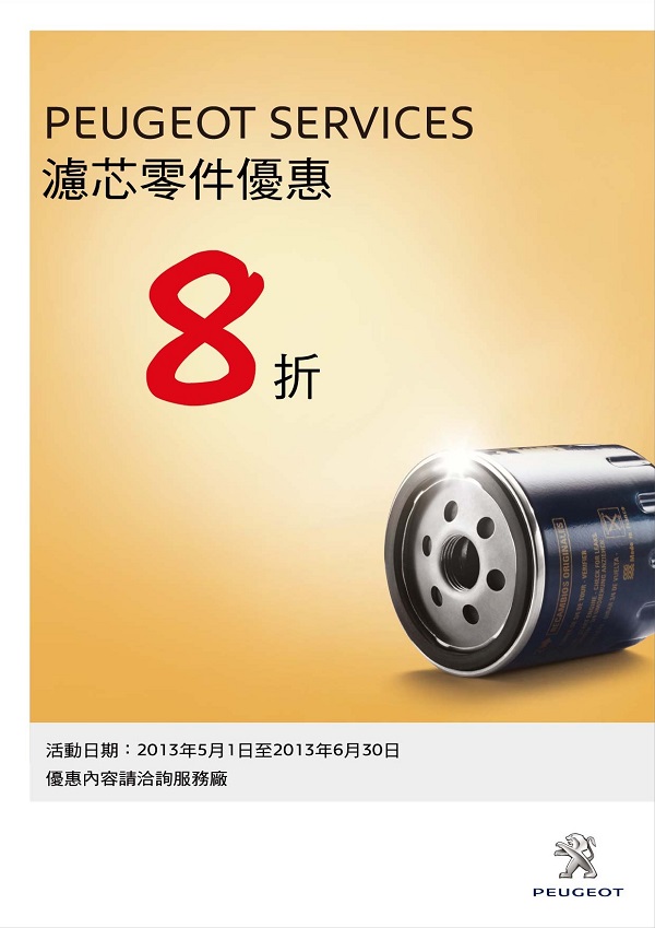 2013 Peugeot Services原廠零件優惠活動實施中,4月~5月火星塞及多項電氣系統零件8折優惠,歡迎車主把握活動期間回廠,至全台Peugeot服務廠由專業技師提供診斷建議。2013 Peugeot Services原廠零件優惠活動詳情請洽詢各地Peugeot經銷商授權服務廠。