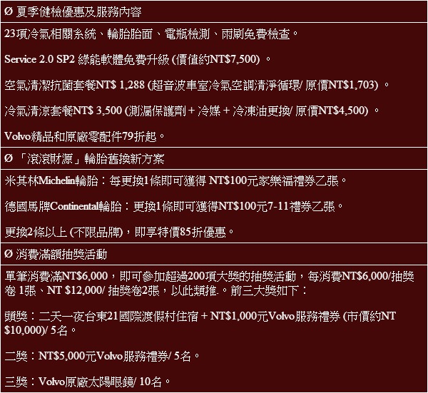 免費冷氣健檢活動不僅提供免費冷氣相關系統檢查及價值約NT$7,500的Service 2.0 SP2綠能軟體免費升級,還可輕鬆享有冷氣套餐及多項零配件、Volvo精品等超值優惠,消費滿額還有機會獲得豐富大獎。歡迎所有Volvo車主朋友們盡速預約回廠參加免費冷氣健檢活動,和家人朋友們一同享受Volvo帶來的清涼夏日!
