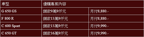 BMW總代理汎德公司即日起針對旗下C 600 Sport、C 650 GT、BMW街車 F 800 R以及BMW 越野車款G 650 GS,推出「都會菁英」低利優購專案。