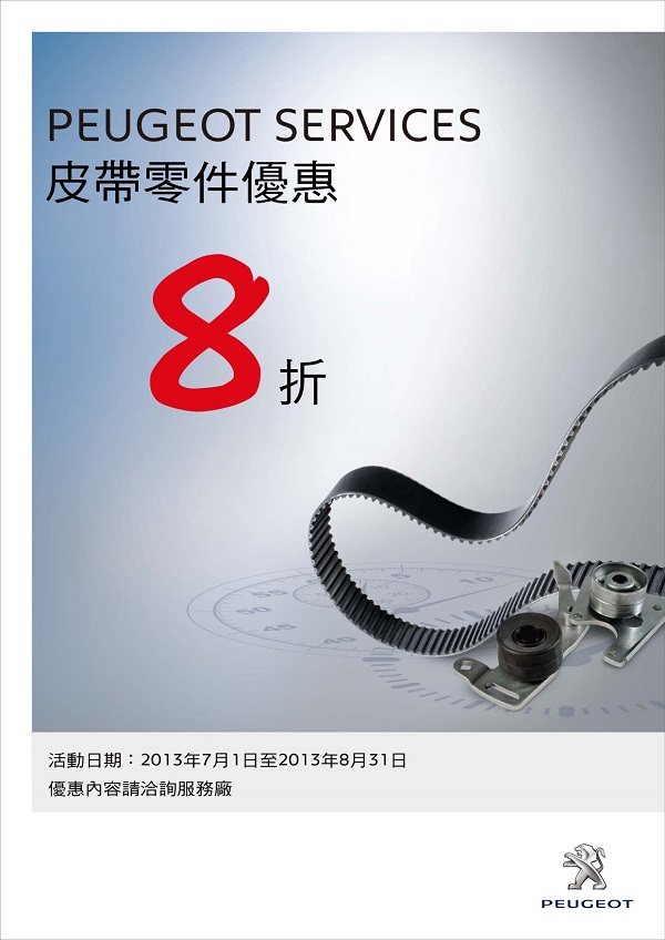 隨著時序進入了夏至,2013 Peugeot Services原廠零件也推出皮帶類零件特惠活動,即日起至8月31日活動期間回廠,即可享有皮帶類零件8折優惠。