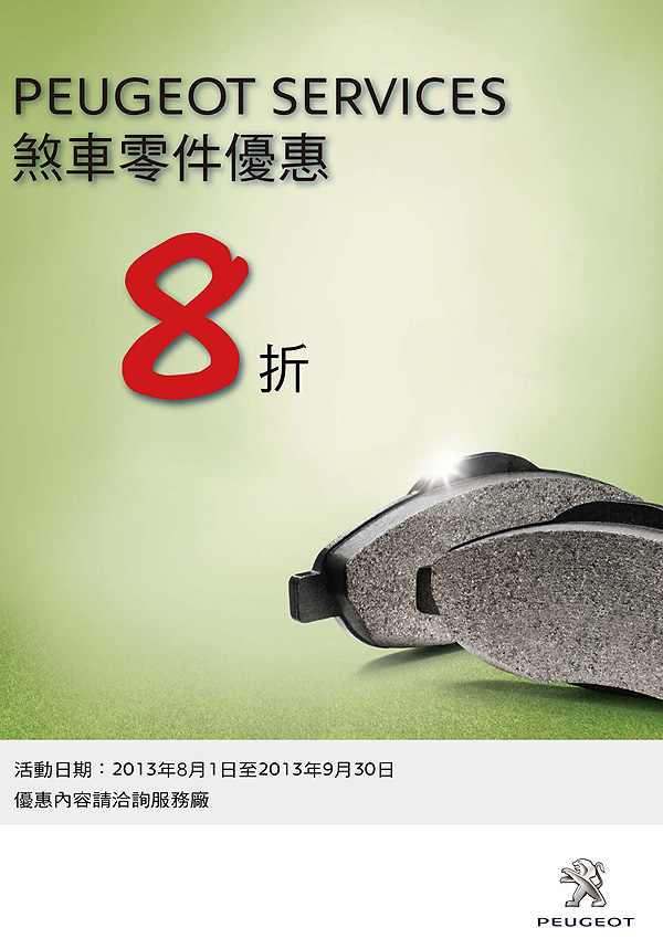 煞車系統是行車安全最重要的一環,Peugeot總代理寶嘉聯合以守護車主之責任,特於2013 Peugeot Services原廠零件優惠活動中推出煞車類零件特惠,凡於8月1日至9月30日活動期間內回廠,即可享煞車類零件8折優惠,在您享受Peugeot駕馭樂趣的同時,也能保持優異的制動性能。