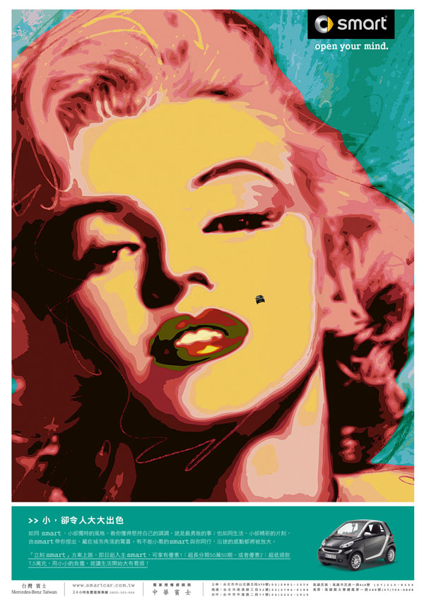 smart fortwo獨特的創意始終緊扣眾人的目光!是誰讓瑪麗蓮夢露這麼「出色」?當然是smart!以小巧車身創造出大空間、大安全、大想像的smart,搭載「低排污、低油耗、低噪音」尖端科技,大大震撼全球車壇,無論是柴油版本、油電混合版本、電動版本,永遠領先別人大大一步!更毫無疑問成為當今時尚微型車的代名詞。