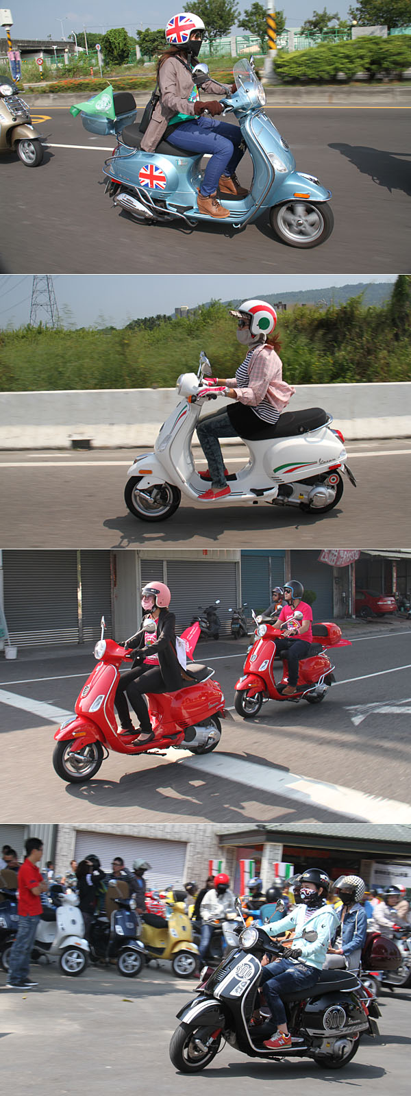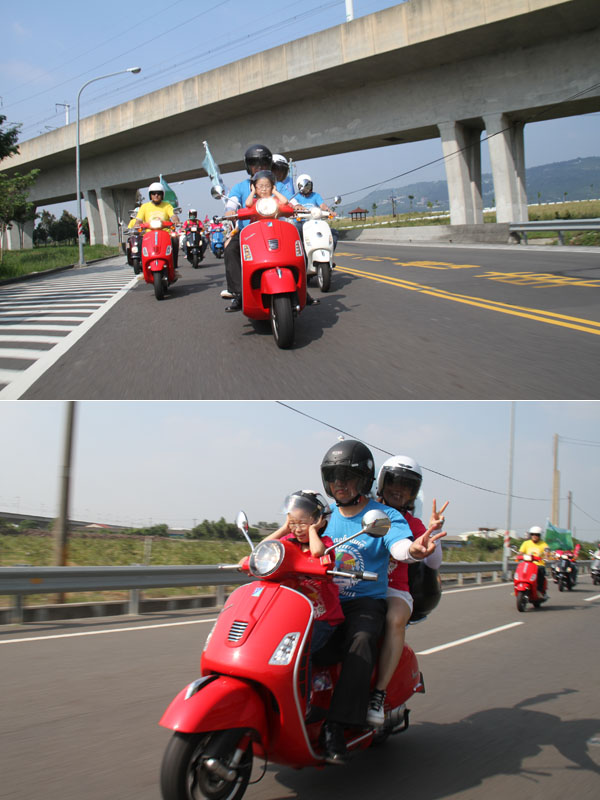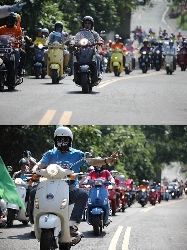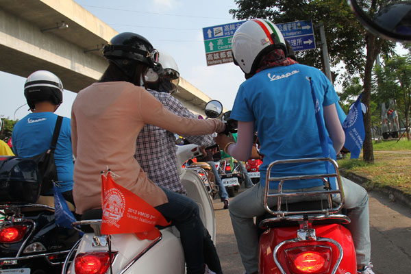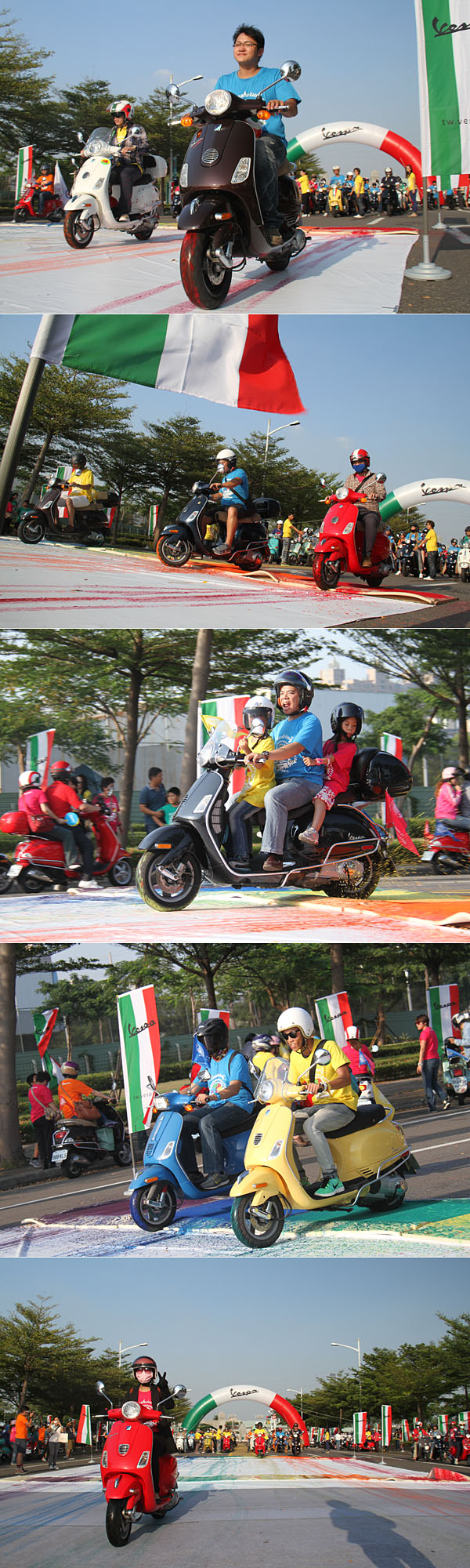 在前導車的帶領下,數百輛Vespa謹遵秩序的接連前進,有帥氣的單人騎士、有濃情蜜意的情侶搭檔、有全家出動的親子共乘、也有偕同好友的死忠夥伴;不分S系列、LX系列或是GTV與GTS車型,騎乘著Vespa共同出遊,臉上總是掛著滿滿自信笑容,更不斷的獲得來自路旁的欽羨眼光,與來自重機騎士的大拇指肯定。