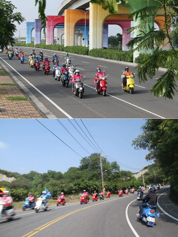 各色各樣的Vespa更與一路上彩色橋頭、黃色岡山捷運站、藍色高雄巨蛋、紫色高捷紫橋與褐色月世界等相互呼應。