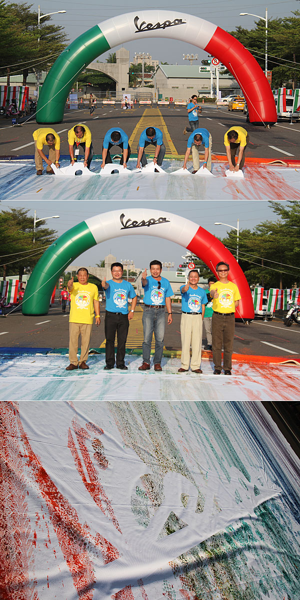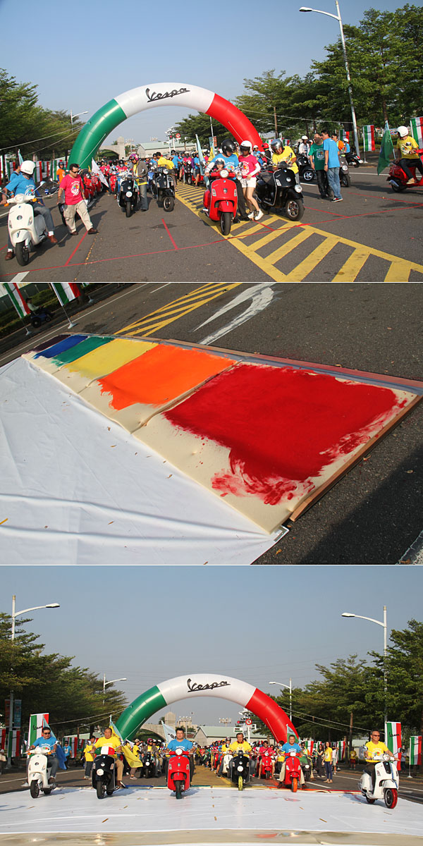 當車隊一路浩浩蕩蕩的抵達了目的地夢時代的代彩虹大道,在此迎接車友們的,是特地打造的彩虹跑道,將車隊一分為五穿越精心打造的六色彩色顏料,紅、橙、黃、綠、藍與紫的色彩,車主們歡喜的以愛車輪胎留下最美的彩虹印記,並將預先安排好的Vespa貼紙撕下,這獨一無二的彩虹Vespa徽飾,就此成型!