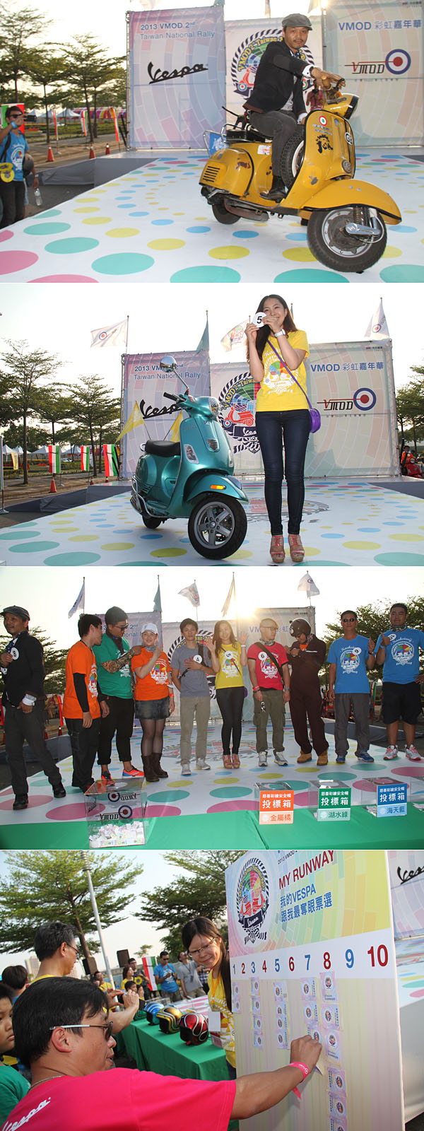 通過了彩虹大道,車主與車友們仍不減玩興,相互於彩虹大道前合影留念外,也暢飲著大古運通提供的清涼飲料,並互相討論始終聊不完的Vespa車經;同時,太古運通也隨即舉辦「城市就是我的伸展台」活動,每種車色的代表車主上台展示,可看見那自信滿滿的臉龐,與對於Vespa愛車的著迷,而經過票選之後,也選出了當日最耀眼的Vespa車款與車主。