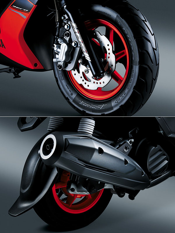 - 酷焰黑-打破傳統的摩托車色彩搭配原則,採用具神祕感的深灰色取代純黑,搭配上熱情如火的鮮紅色輪圈,以強烈對比的色調組合,呈現冷酷和熱情並存的面貌。