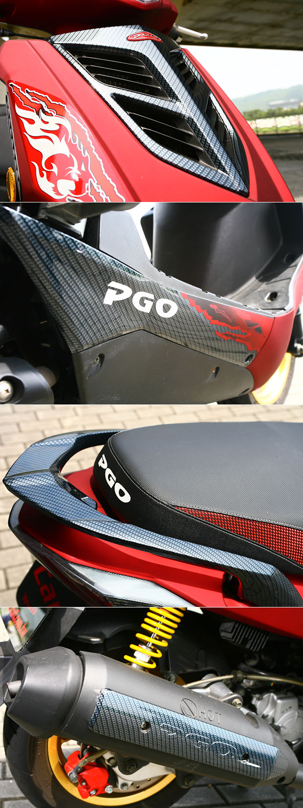 當然,這不是此次最重要的亮點,更重要的是,Tigra 150 2014限定式樣版不僅換上了獨一無二的迷霧紅車色,以當前最流行的消光車色,搭配上去年特式車款的類碳纖維飾板,從車頭斜板的前盾牌、後扶手、排氣管上的防燙飾蓋等處,皆運用了此飾板點綴,於視覺面呈現相當飽滿的運動風格,清楚展現出PGO針對時下年輕購車族群偏愛的口味下足猛藥,就是要吸引目光為主!當然,這也與蔡小佩一身凹凸有致的迷人曲線一樣,這S型曲線一出,誰與爭鋒!