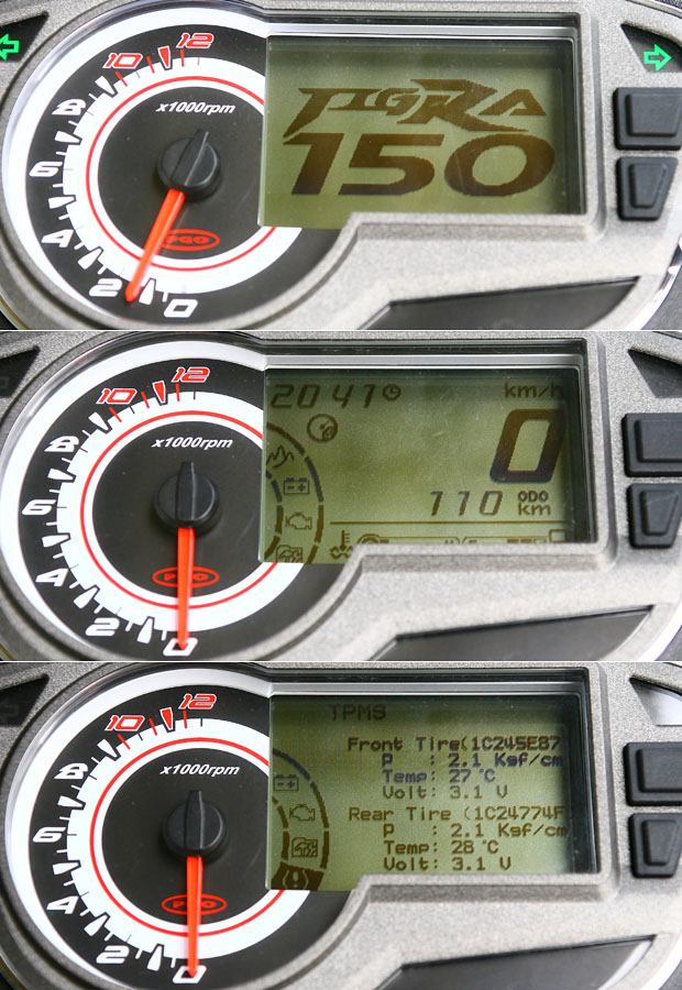 此外,考量輪胎對於用車安全的重要性,自103年11月1日開始,新出廠的四輪汽車將要強制搭載胎壓監測系統,雖無針對兩輪機車強制,但為了進一步提升用車安全,Tigra 150 2014限定式樣版將TPMS無限胎壓監測系統列為標準配備,只需透過3吋液晶MMI智慧多功能儀表的切換,就可清楚了解目前車輛前後輪的胎壓與胎溫,更精準的掌控輪胎狀況,盡可能的降低因胎壓不正常造成交通意外的可能性,這也是近年來PGO一貫堅持的造車理念,安全至上,從過去的前後碟煞、ABS系統導入,到此次TPMS無限胎壓監測系統的加載,清楚說明。