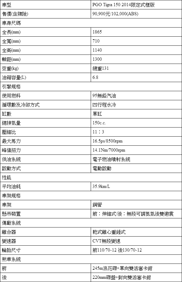 或許論品牌規模,PGO摩特動力不是很多消費者第一個聯想到的國產機車品牌,但這絕對不影響PGO對於旗下車款的開發用心。從有著重機靈魂的G-Max開始,到同級距中搶先搭載水冷動力的Tigra車系,將它家著重於電視廣告曝光的大量資金,轉為對於產品力的開發,與對於旗下車款的配備用心。從旗下多款車系的前後碟煞規格、全球獨具的輕型速克達車型搭載ABS防鎖死煞車系統,再再展現出了PGO對於車輛規格、駕馭享受與安全用車等觀念的著重。也因此,從網路面的市場口碑發酵,PGO成為了許多重C/P值的內行人之購車首選。而論C/P值,Tigra 150 2014限定式樣版,更是第一把交椅。