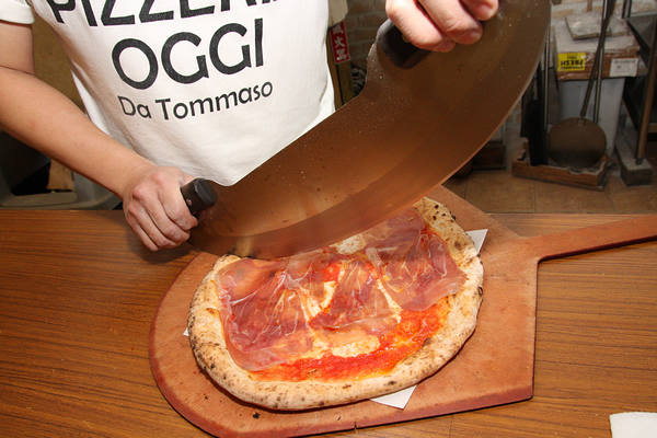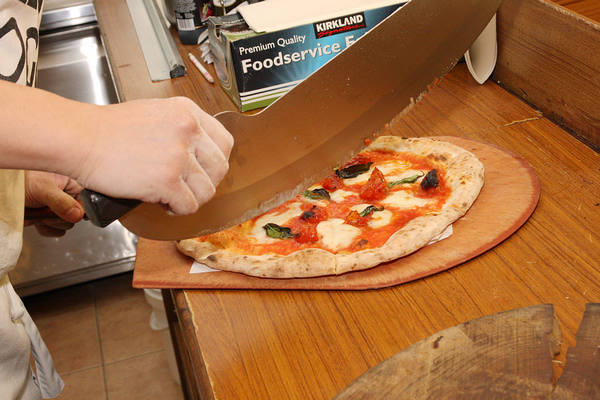 大刀將傳統拿坡里披薩切片。