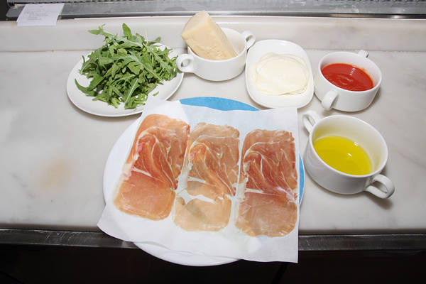 製作帕馬火腿芝麻葉披薩所需的馬芝拉乳酪、番茄泥、義大利帕馬火腿、有機芝麻葉、2年熟成帕達諾乳酪與初榨橄欖油。