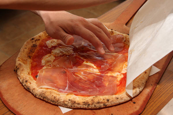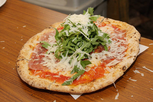 窯烤出爐的帕馬火腿芝麻葉披薩。
