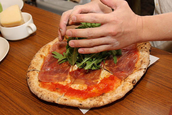 帕馬火腿芝麻葉披薩的製作同樣是從手工甩成餅皮開始。