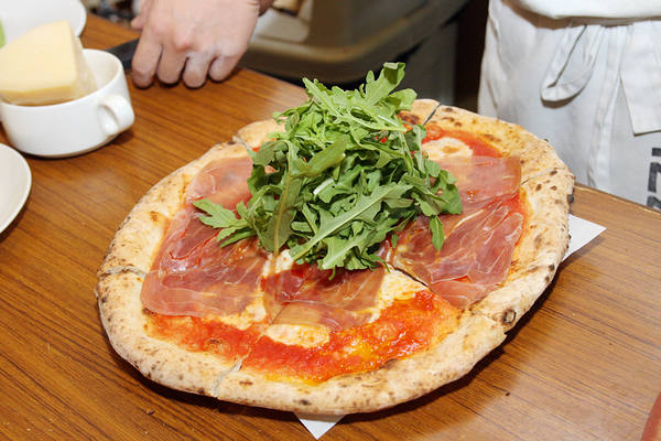 只吃了傳統拿坡里披薩當然還不過癮,「帕馬火腿芝麻葉披薩」的製造方法與窯烤方式相同,配料包括馬芝拉乳酪、番茄泥、義大利帕馬火腿、有機芝麻葉、2年熟成帕達諾乳酪與初榨橄欖油。每一口除了吃的到餅皮的用心,更有著肉、奶、生菜與植物油的融合驚喜,再次強調,現烤的真的很棒。