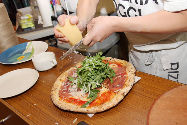在PIZZERIA OGGI可以吃到正宗的義大利拿坡里披薩,而AVPN(義大利拿坡里披薩協會)認可「拿坡里披薩」的稱號屬於Marinara水手披薩(蕃茄、橄欖油、奧勒岡與大蒜)、Margherita瑪格麗特披薩(蕃茄、橄欖油、莫札瑞拉與羅勒)所有,且同時需在感官、銷售、原料、準備與烹飪各個層面也符合規範。而因採訪得以享受到義大利美食的我們,在推薦之下點了「傳統拿坡里披薩」與店裡高人氣的「帕馬火腿芝麻葉披薩」。