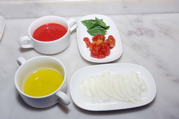 製作傳統拿坡里披薩所需的新鮮水牛馬芝拉乳酪、番茄泥、義大利番茄乾、甜羅勒與初榨橄欖油。