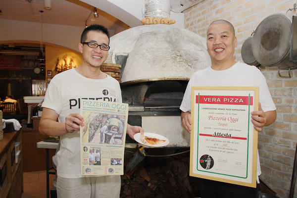 右起義大利烹飪達人謝宜榮、PIZZERIA OGGI主廚吳國華,拿著AVPN(義大利拿坡里披薩協會)頒發的證書與菜單、披薩。