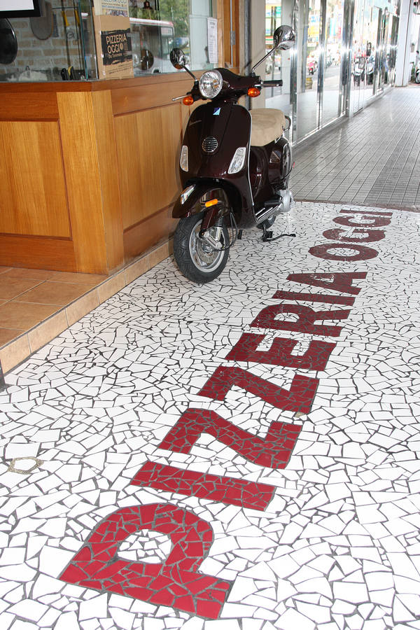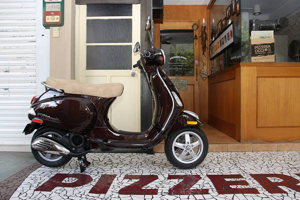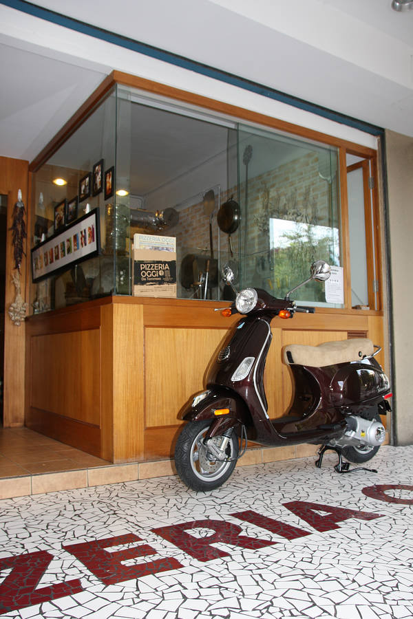 蜜糖棕色的VESPA LX150,恰巧與地面上的PIZZERIA OGGI店名拼磚為同色調。