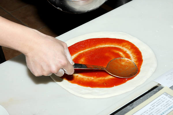 示範添加醬料讓吃披薩更道地更享受。
