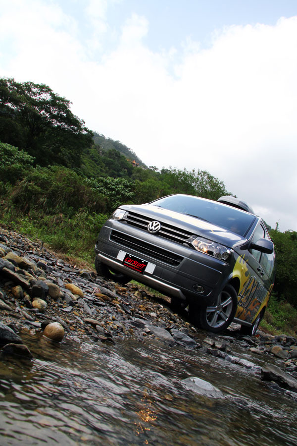 當然,此次試駕車型Caravelle 4Motion SWD 2.0TDI也不例外,在拍照取景過程中,試車組們將其駕駛至滿布大小礫石的河床上,雖然以其所配置的性能胎、加上並未刻意拉高的車身高度,此般的越野體驗似乎稍嫌苛求了點,但為求攝影角度的需要,且在謹慎的路線選擇中,其實Caravelle 4Motion並未讓試車組們失望,連打滑、陷入石堆中的情形皆未發生,此輕度越野狀況的隨堂考,Caravelle 4Motion SWD 2.0TDI高分通過。