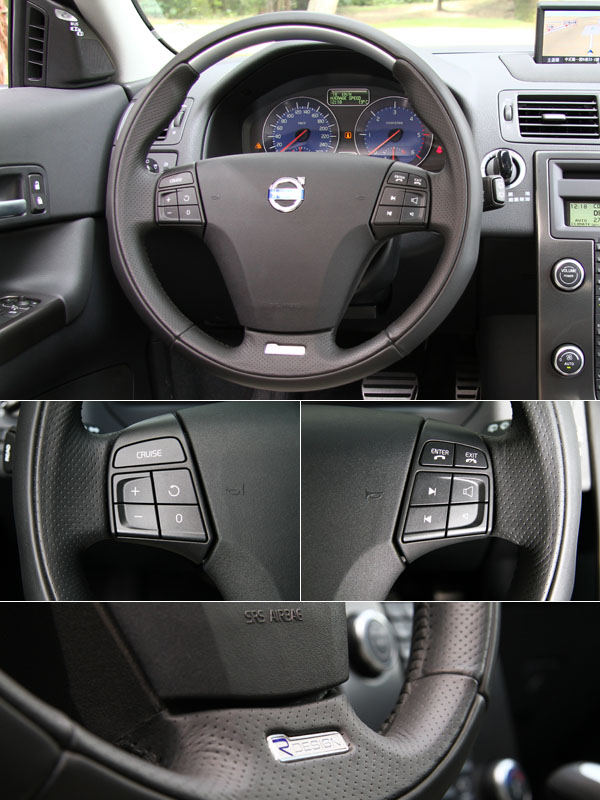 透氣式真皮跑車級多功能方向盤,下方鑲有R-Design銘牌顯示特殊身分。
