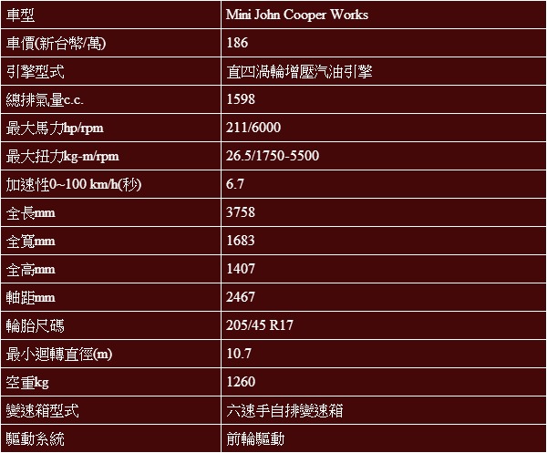 至於其他包括前後保桿、側裙、車身標徽乃至於選用的17吋黑色Cross Spoke Challenge鋁圈、紅色車頂與後視鏡外蓋、John Cooper Works賽車式引擎蓋飾條、Carbon Black飾條及內裝與Chili Red內裝飾板(僅飾板需加價7000元選配,其他微0元選配件),則都屬於Mini John Cooper Works額外付加的Bonus而已,那是給虛榮或膚淺的觀眾看的,懂車如你坐進車內,絕對能夠知道這輛車之所以值186萬元身價的理由,其靠的除了稀有身分外,還在於更上層樓的操駕快感,而這點,正是Mini John Cooper Works真正欲與車主溝通的語彙。