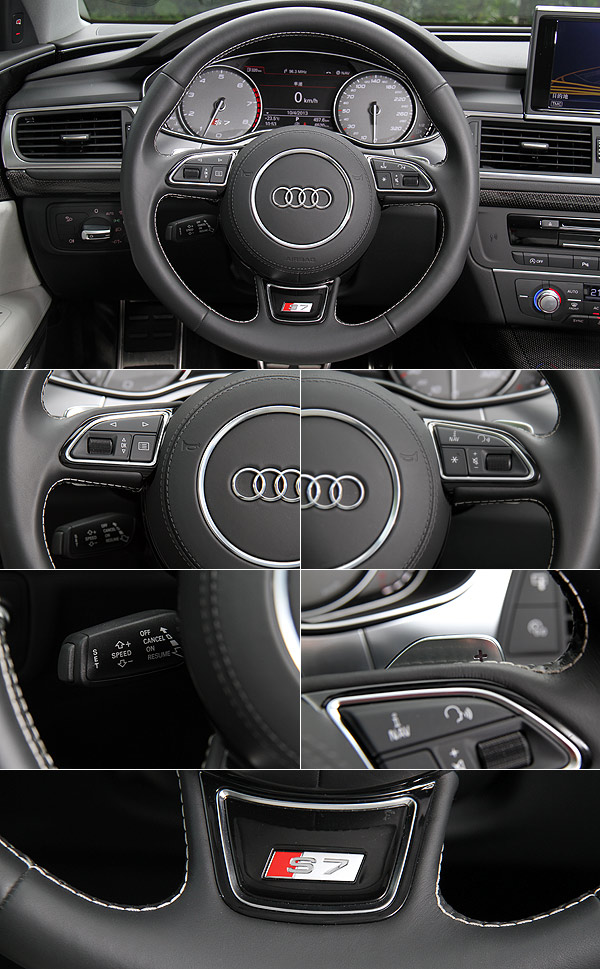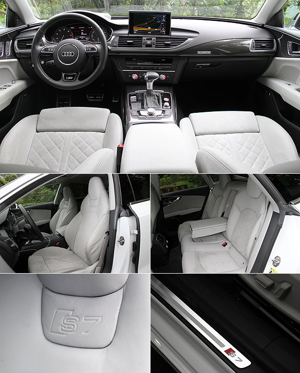 然而,定位在豪華性能4門Coupe的S7 Sportback仍免不了質感的修飾,從座椅的格紋到標配4區恆溫空調、電動天窗、後檔遮陽簾、電動尾門,以及整合3G Plus資訊硬體整合系統與MMI touch觸控手寫版的MMI多媒體操控介面等高規格的配備鋪陳,仍可看出S7 Sportback的不凡。