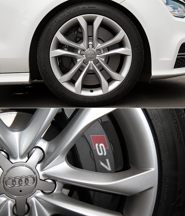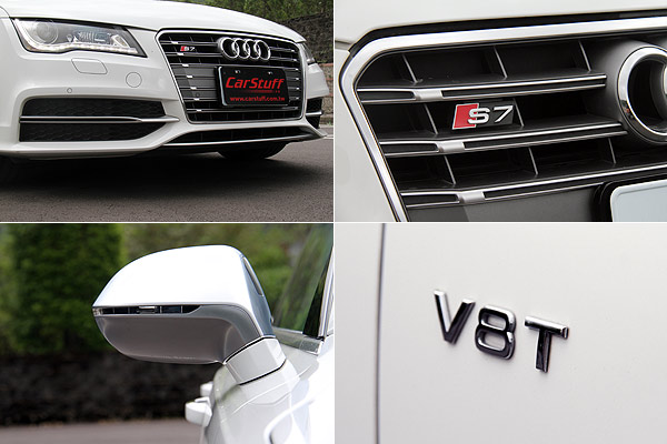 前下巴的導流翼板、水箱罩中的S7徽飾、葉子板上的V8 T字樣與銀色塗裝的車側後視鏡,是S7 Sportback與一般A7 Sportback的不同之處。
