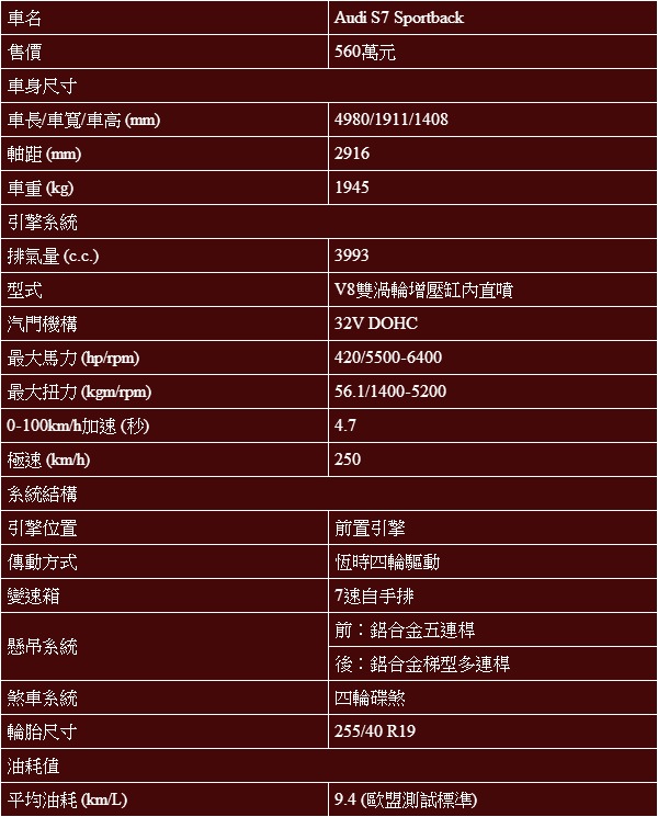S7 Sportback基本規格表: