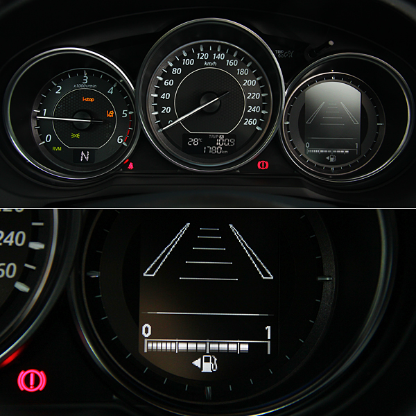 三環儀表設計,右方儀表內為智慧行行車電腦資訊,並有主動安全的車距設定顯示功能。